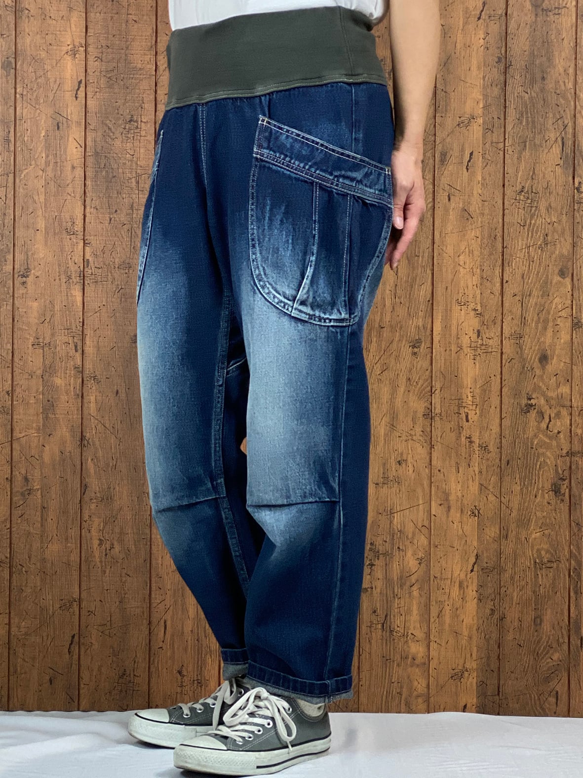 ガゼットクロッチも付いて動きやすく、また両サイドのガーデンポケットのような大きめのポケットもデザイン特徴の一つ。